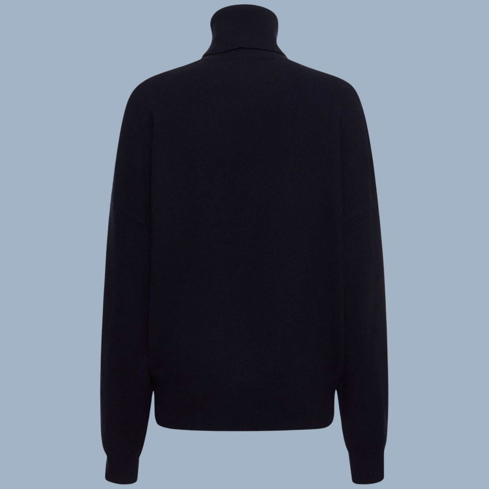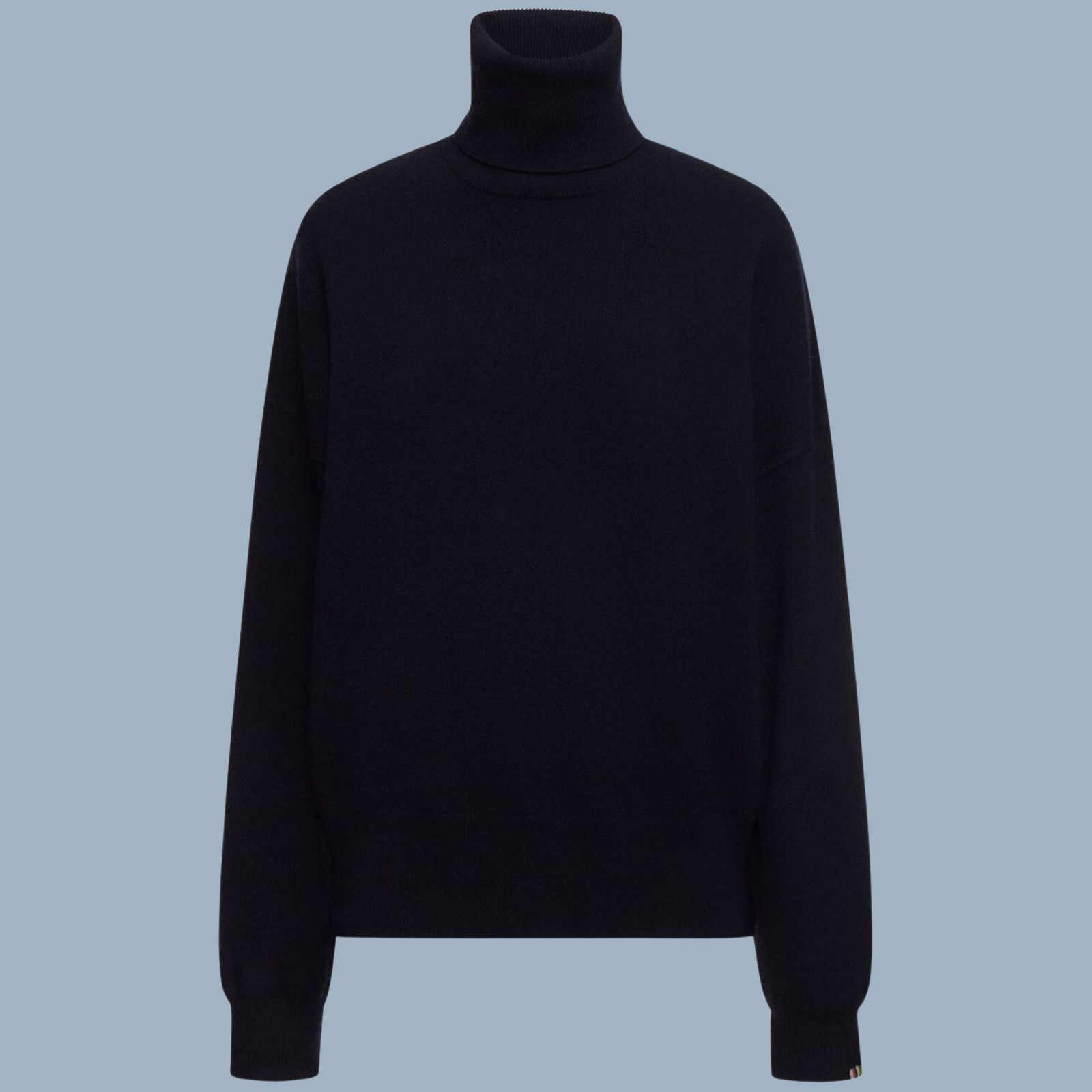 Extreme Cashmere turtleneck N204 Jill in navy. Made in China, of 88% cashmere, 10% nylon, and 2% elastane.