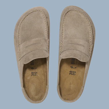 Birkenstock suede Naples in taupe.