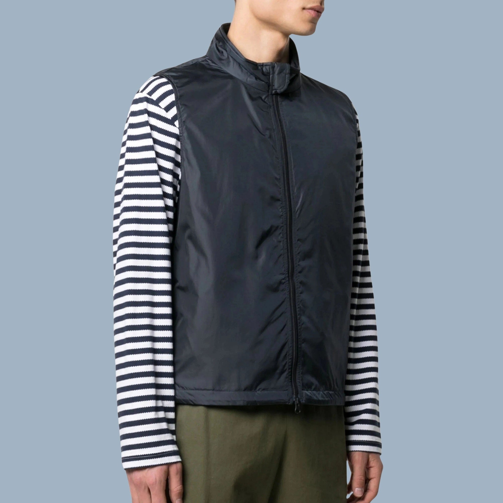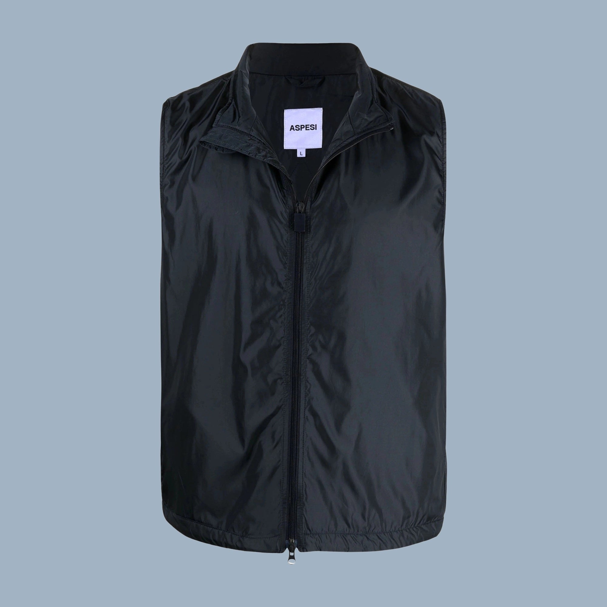 The outer material is 100% polyamide, and the lining is 100% polyester. This navy blue sleeveless jacket features a high neck, front zip fastening, and two side slit pockets.