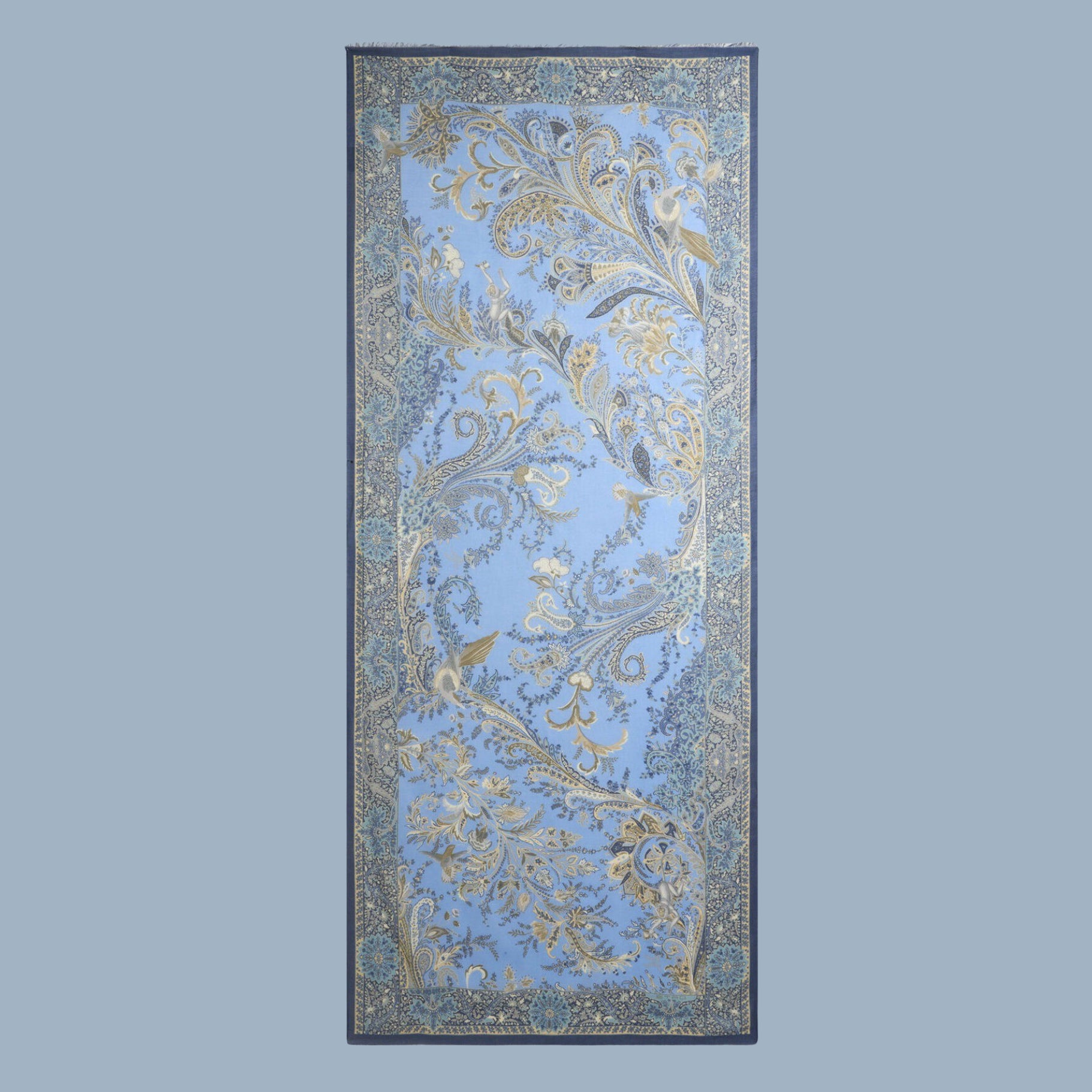 Etro scarf in light blue with paisley pattern. Made in Italy, of 90% modal, and 10% cashmere.