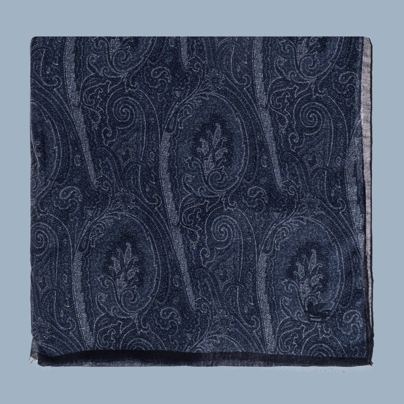 Etro scarf in navy blue with paisley pattern. Made in Italy, of 90% modal, and 10% cashmere.