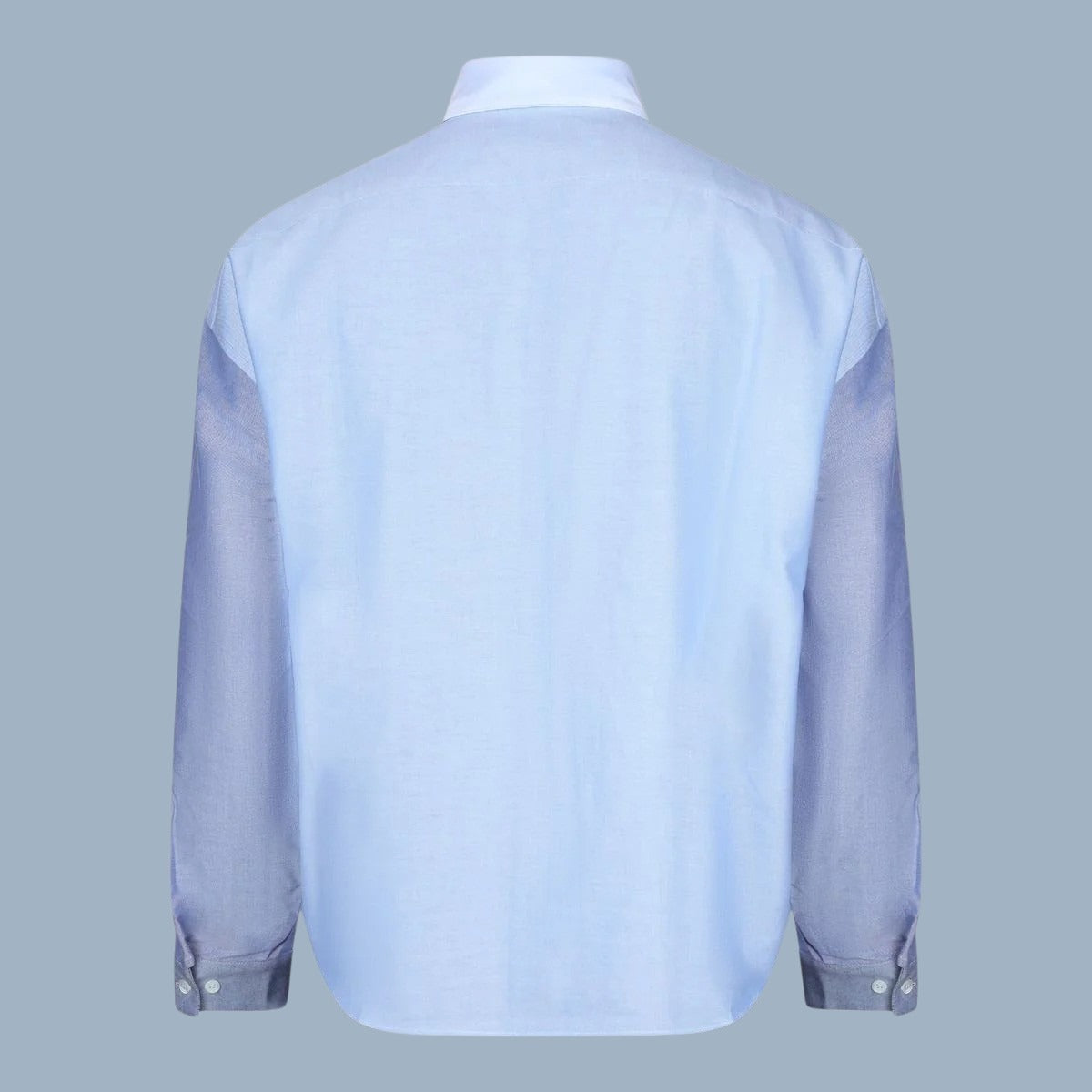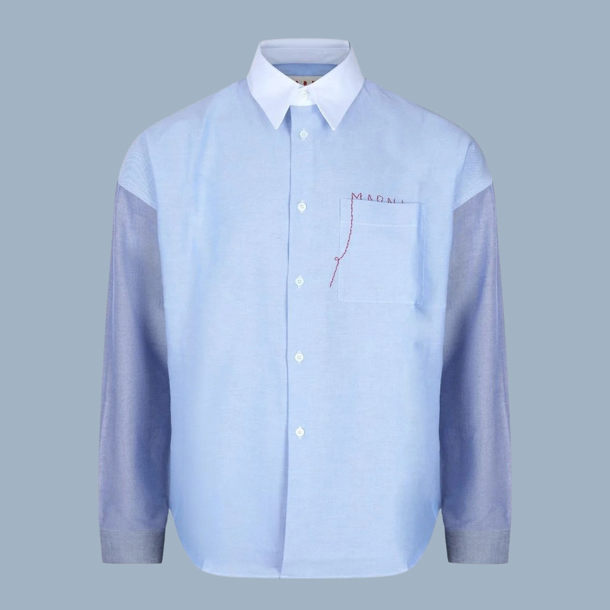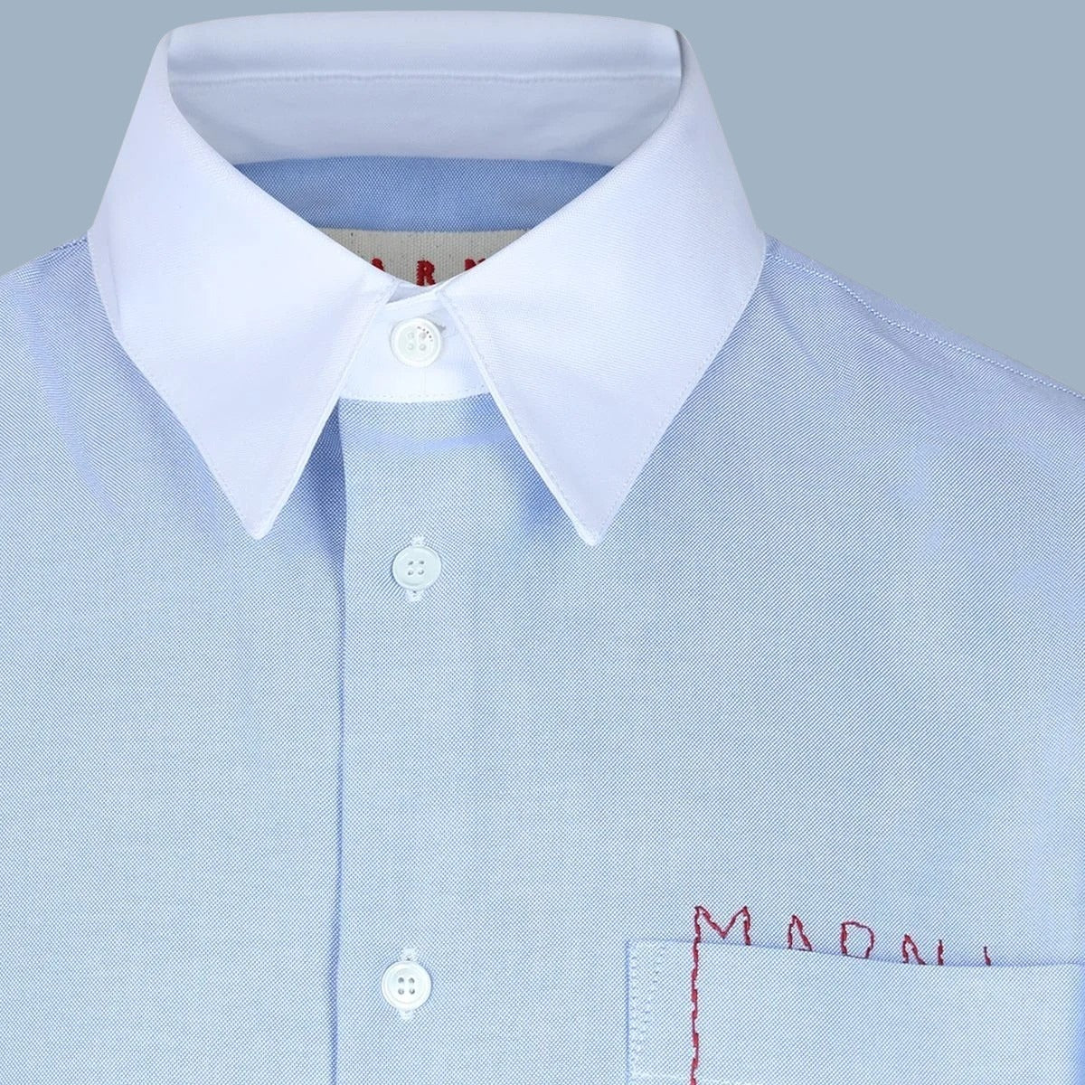 Marni shirt in blue with a white collar and embroided logo on the chest pocket. Made in italy, of 100% cotton.