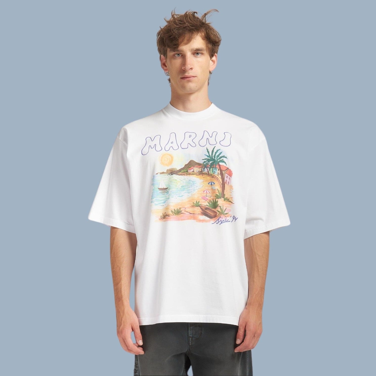 Marni graphic t-shirt with beach print on front. Made in Portugal, of 100% cotton.