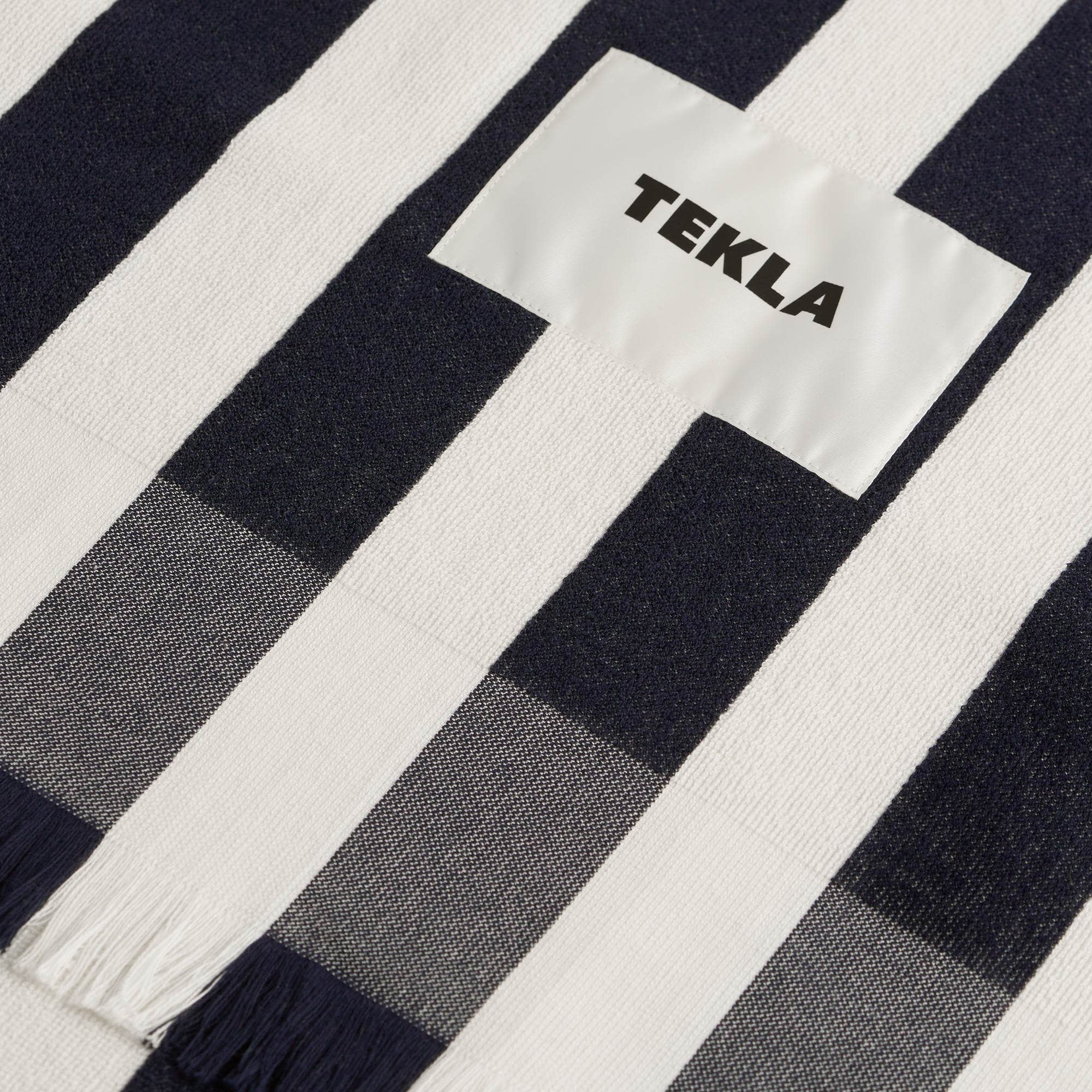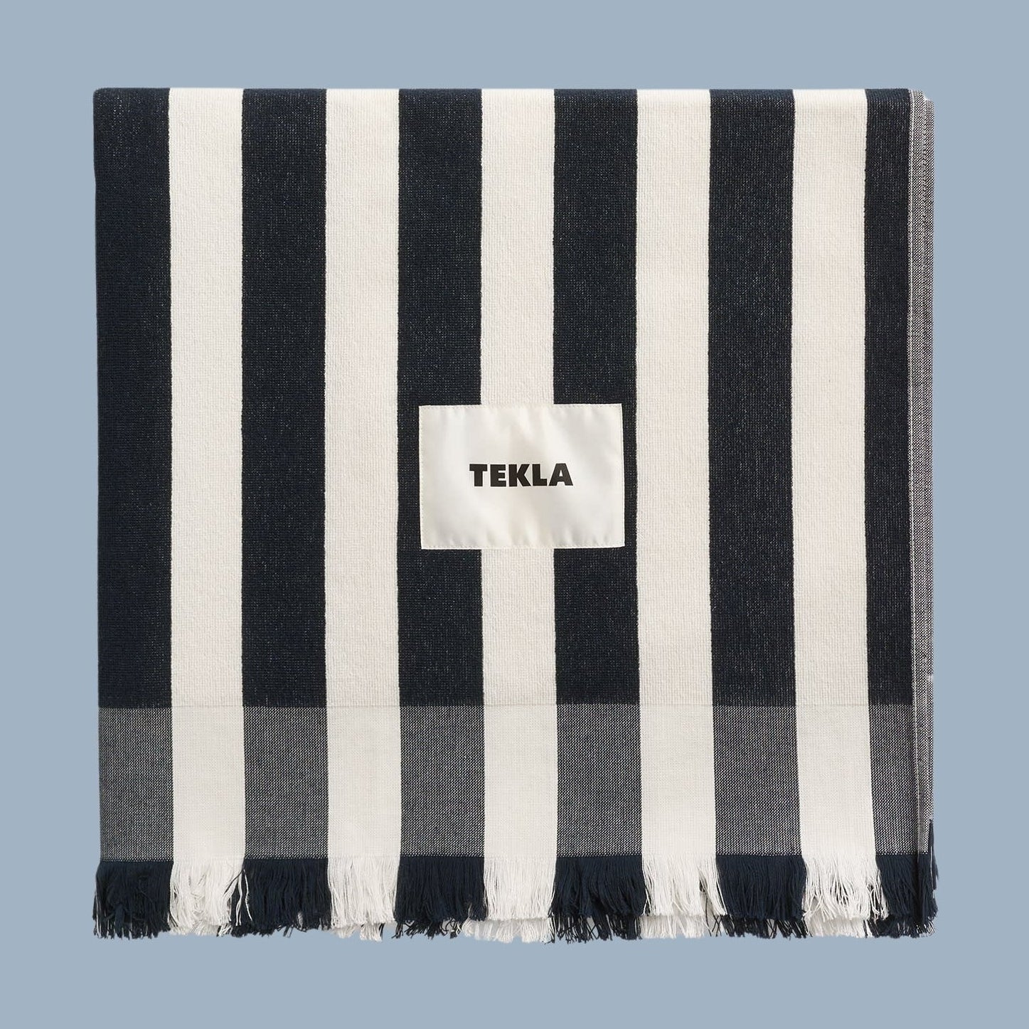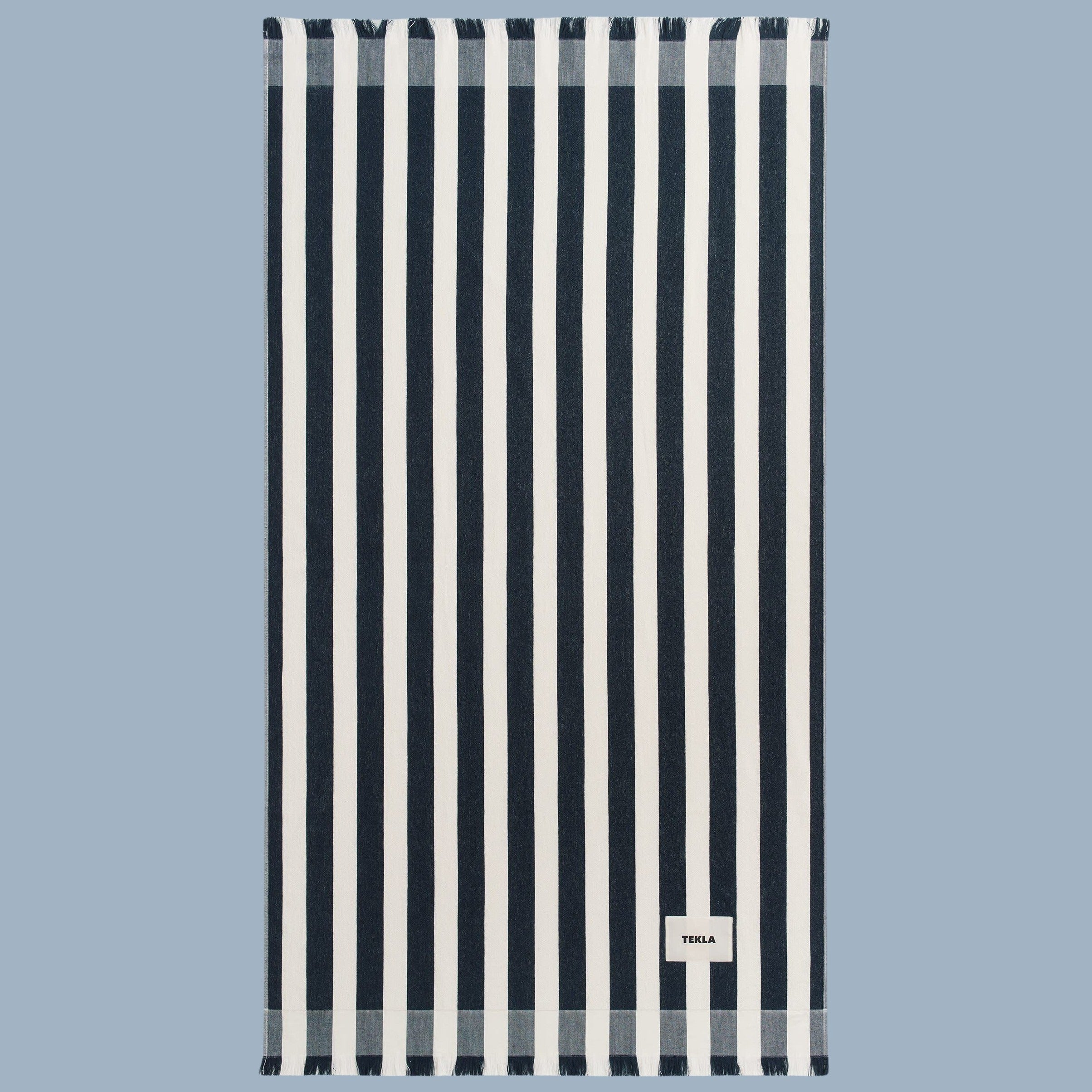 Tekla Beach towel, in white with black stripes. Made in Portugal of 100% organic cotton.
