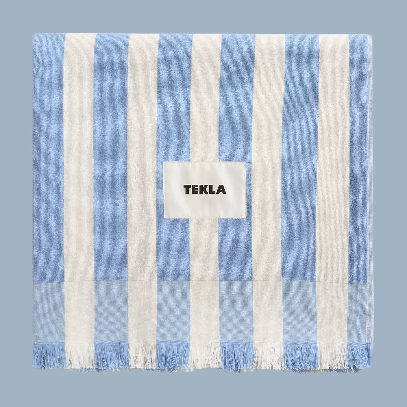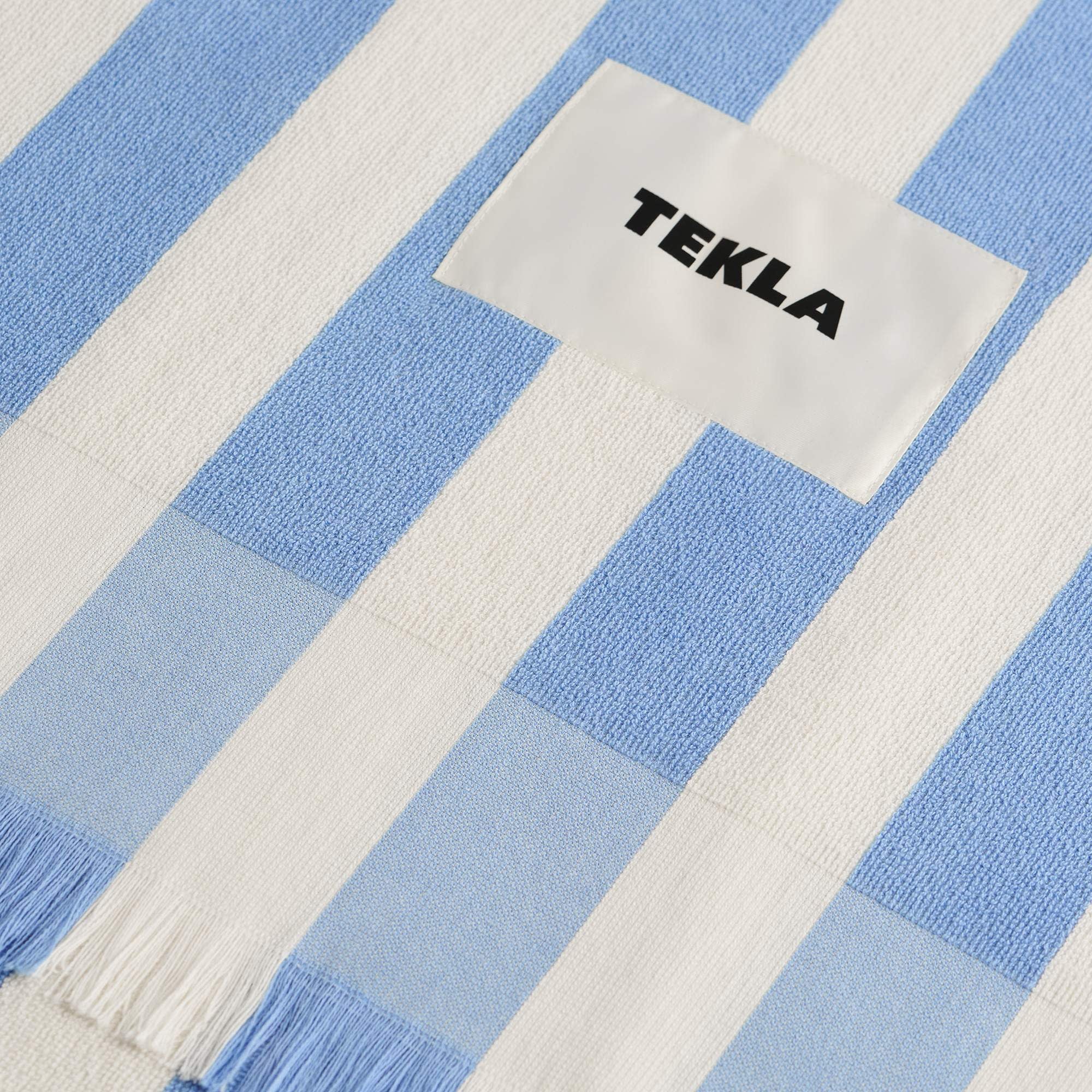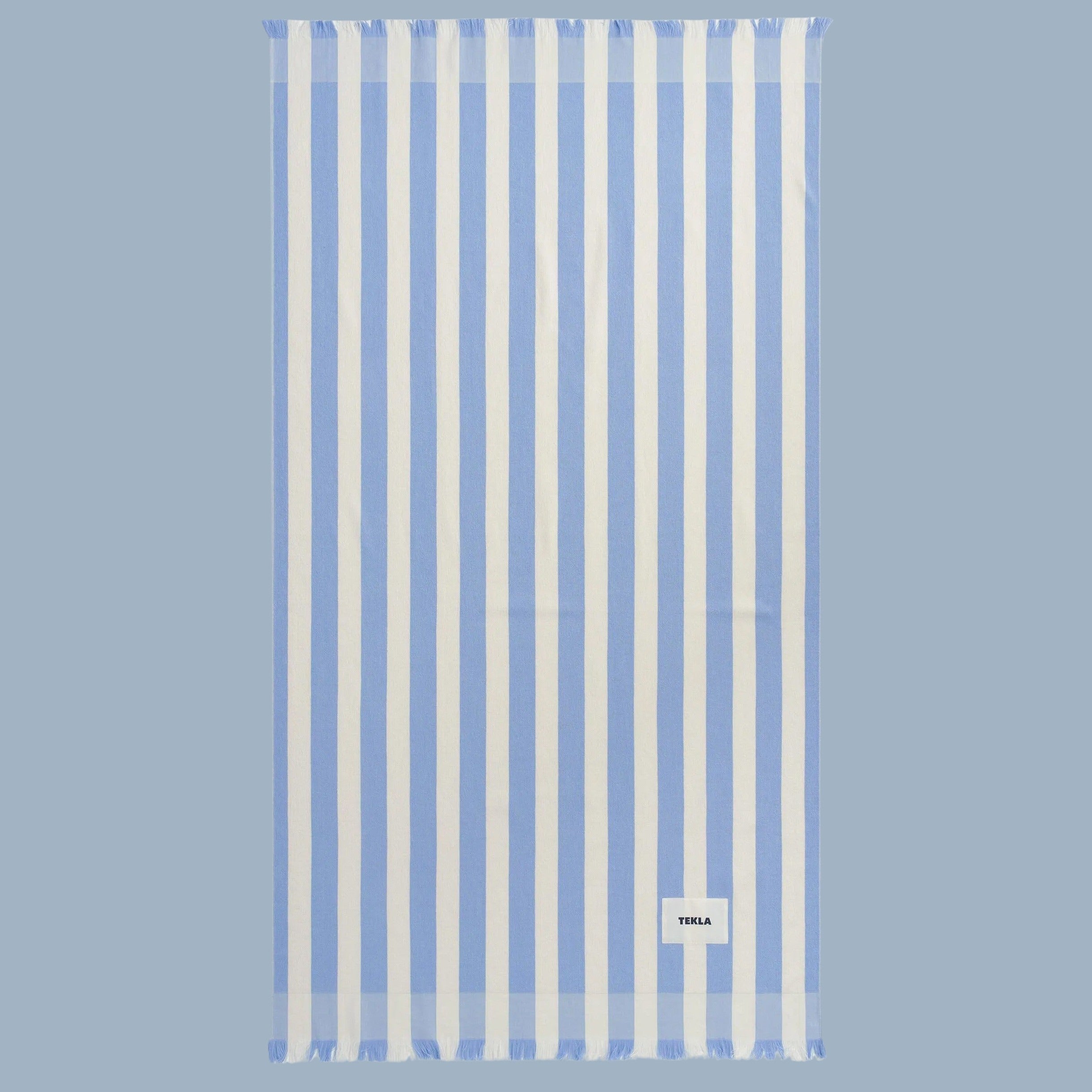 Tekla Beach towel, in white with light blue stripes. Made in Portugal of 100% organic cotton.